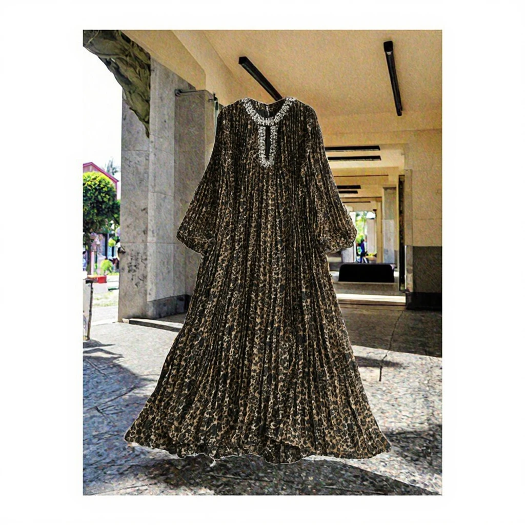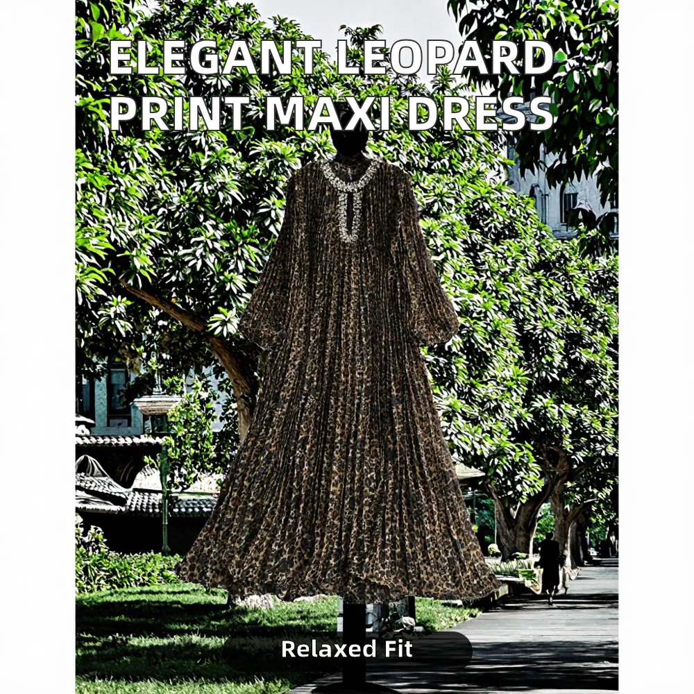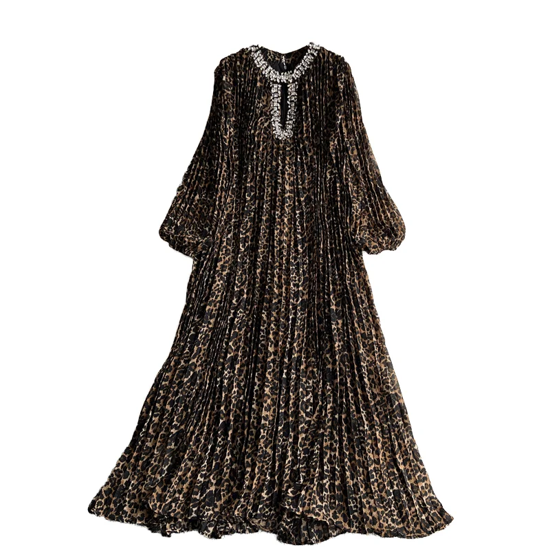 Women's High-End Elegant Pleated Long Dress Loose Slimming Leopard Print Rhinestone Cutout Maxi Fashionable for Spring Autumn